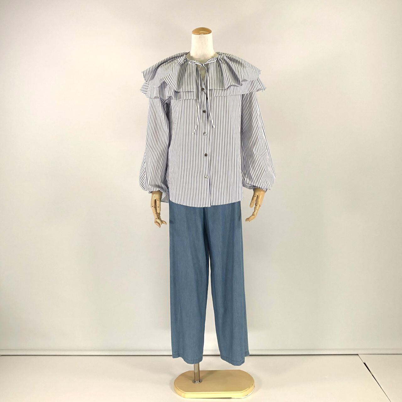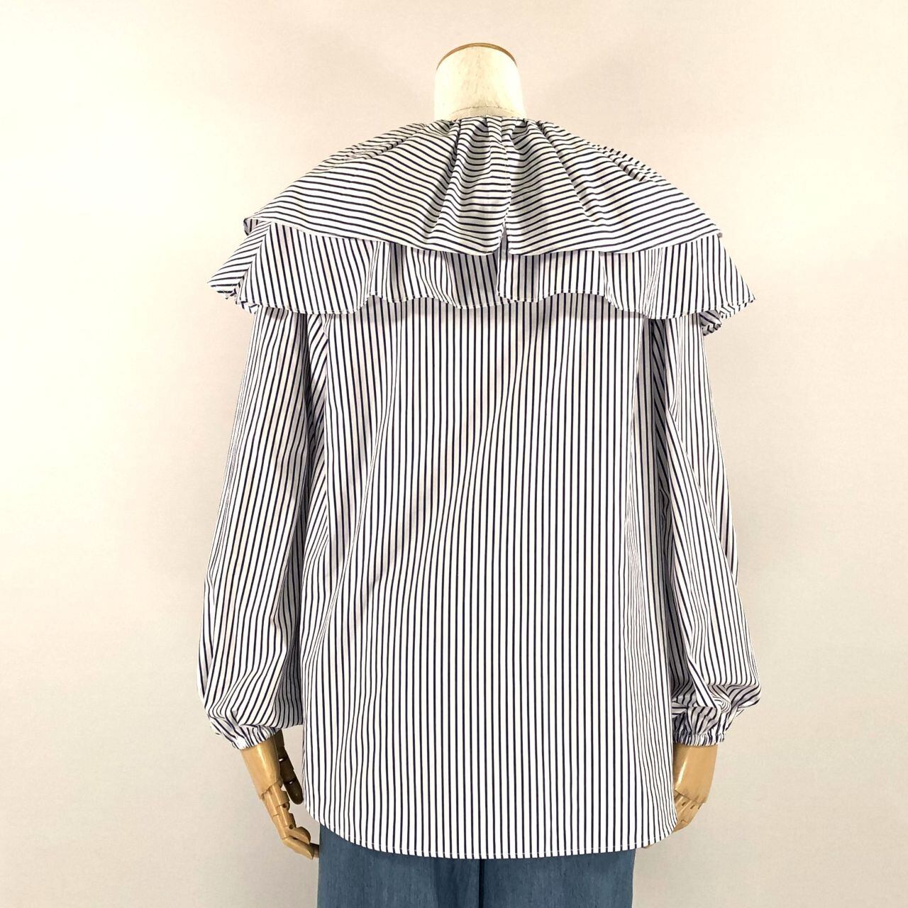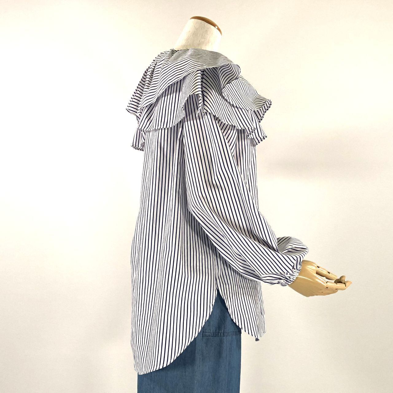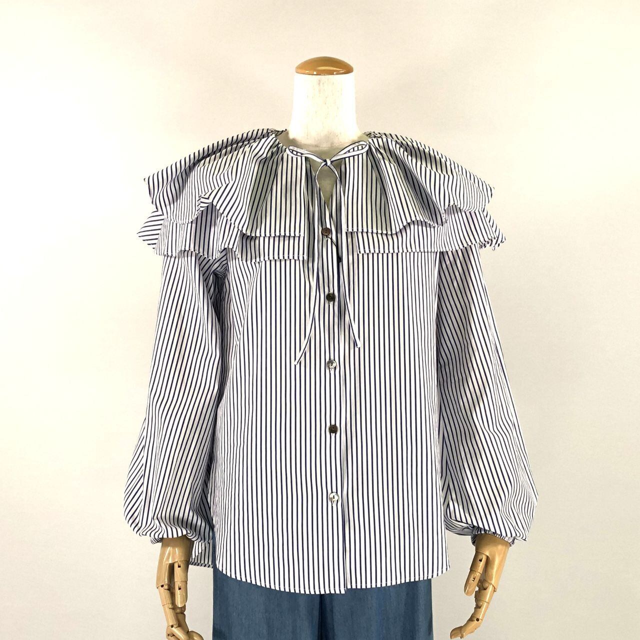 爽やかなホワイトを基調としたこのブラウスは、細やかなブルーのストライプが軽やかさをプラスする一着。大きめの襟がクラシカルな印象を与え、細部にまでこだわった上品なデザインが魅力。シルエットにメリハリのあるデザインは、着用するだけで洗練されたスタイルを完成させます。カジュアルからオフィススタイルまで幅広いコーディネートに対応可能。
