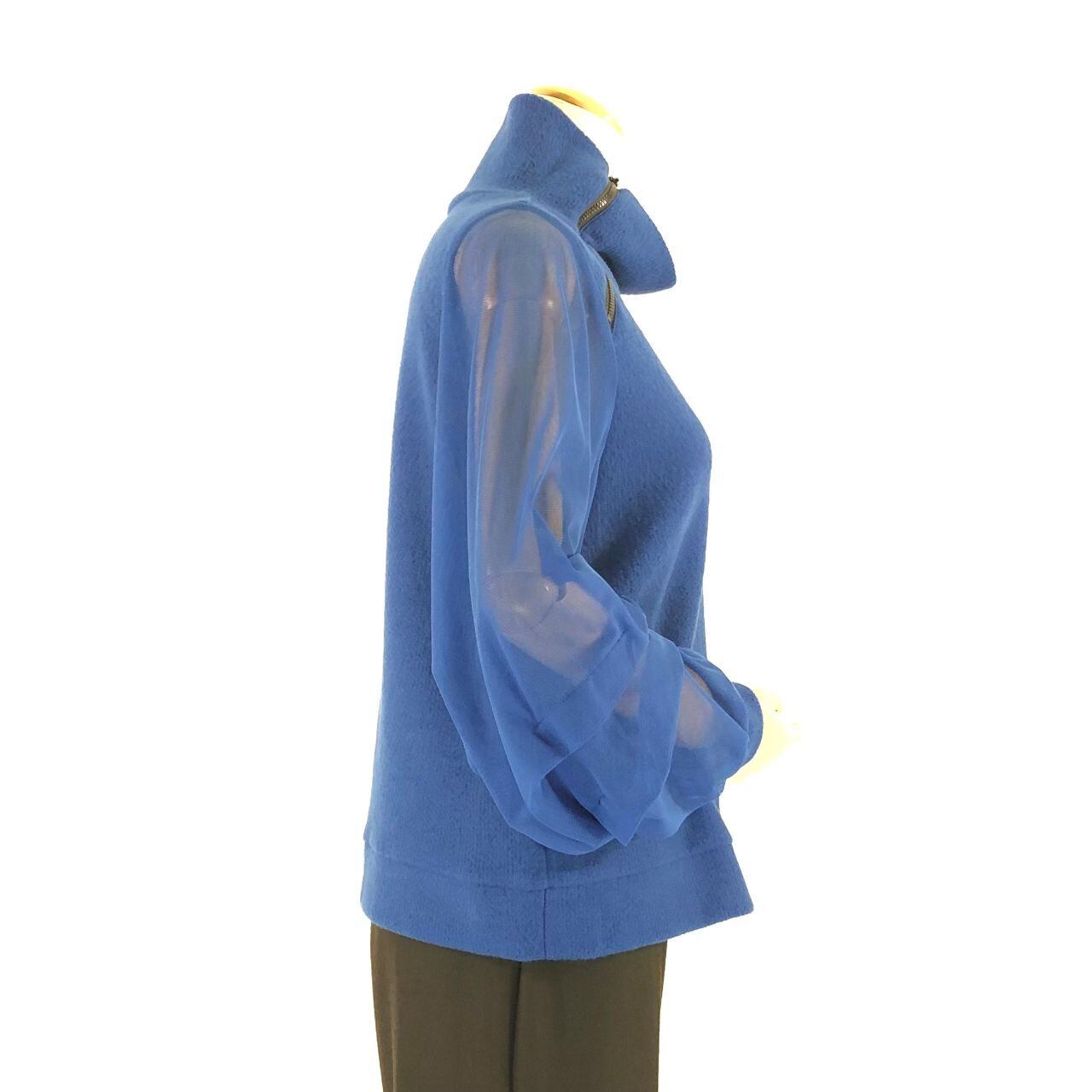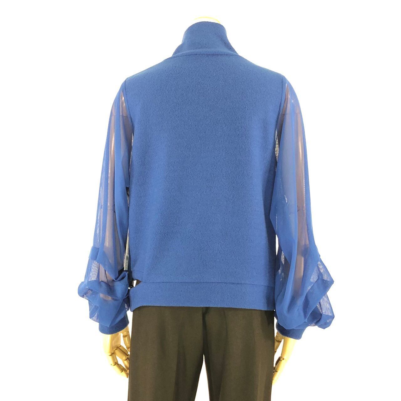 シアーな袖が軽やかに揺れ、上品な透け感が女性らしさを引き立てる一枚。ハイネックとジップディテールがモードなアクセントとなり、クラシックとモダンが美しく融合。シンプルなボトムと合わせるだけで、凛とした存在感を放つスタイルが完成します。