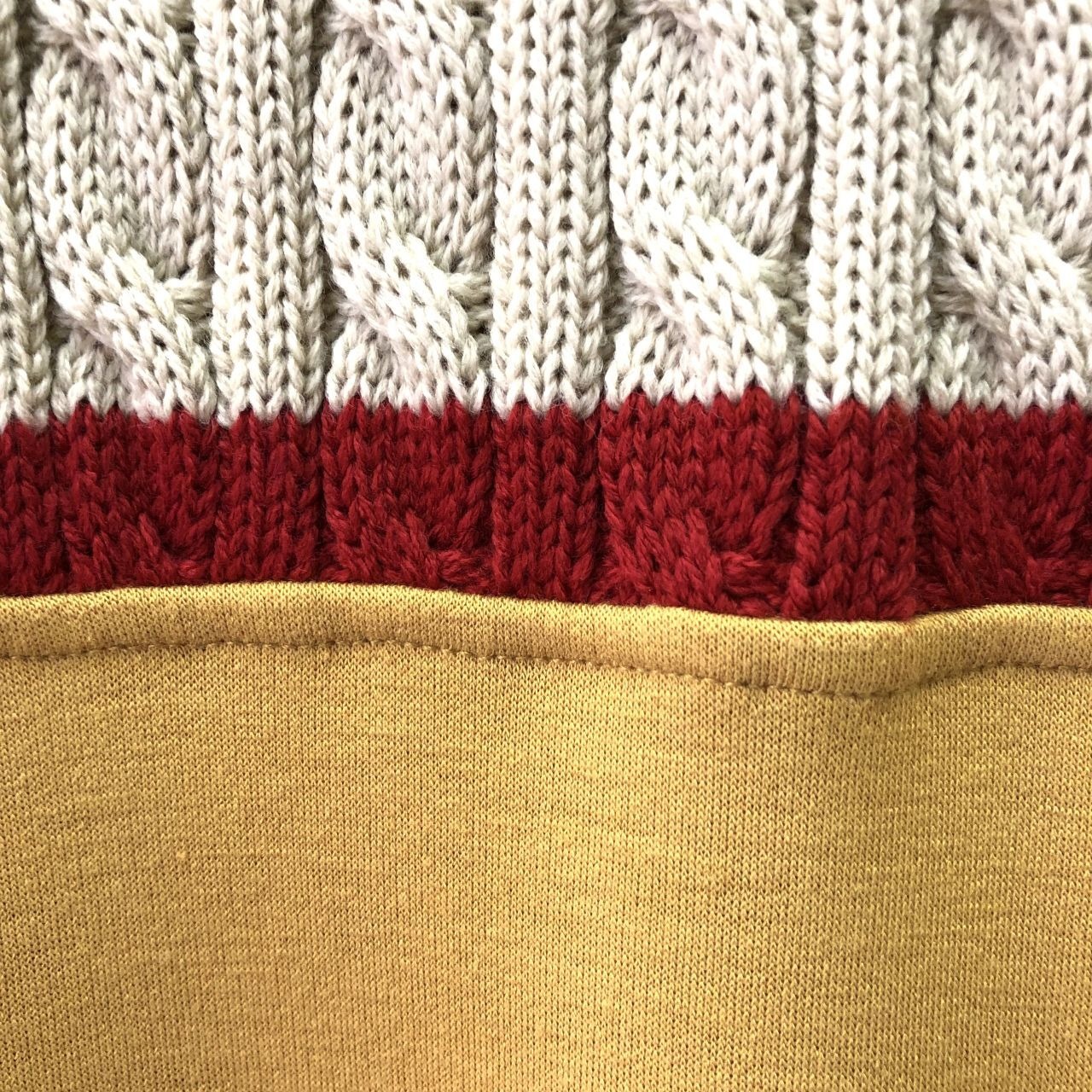 マスタードイエローのボディに、クリーム・レッド・同色のケーブル編みボーダーが胸元と袖に走り、クラシックな雰囲気をモダンに再構築しています。立体感のある編み模様が、視覚的にも触感的にも豊かな表情を生み出し、シンプルながら印象に残るデザインです。