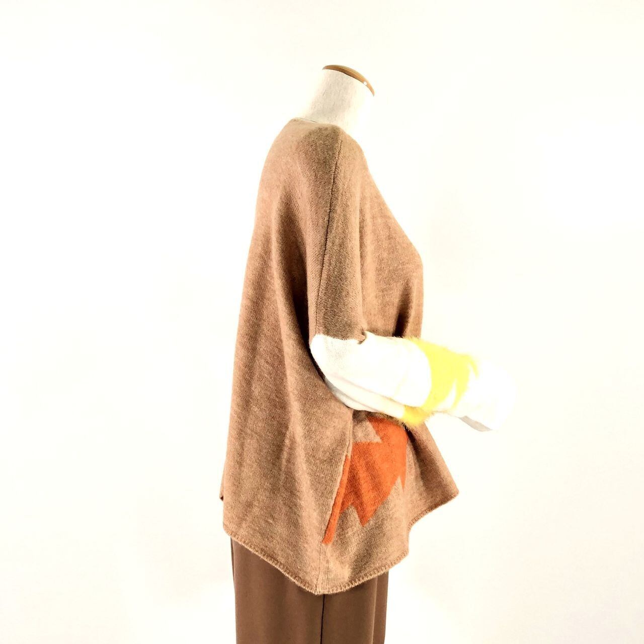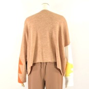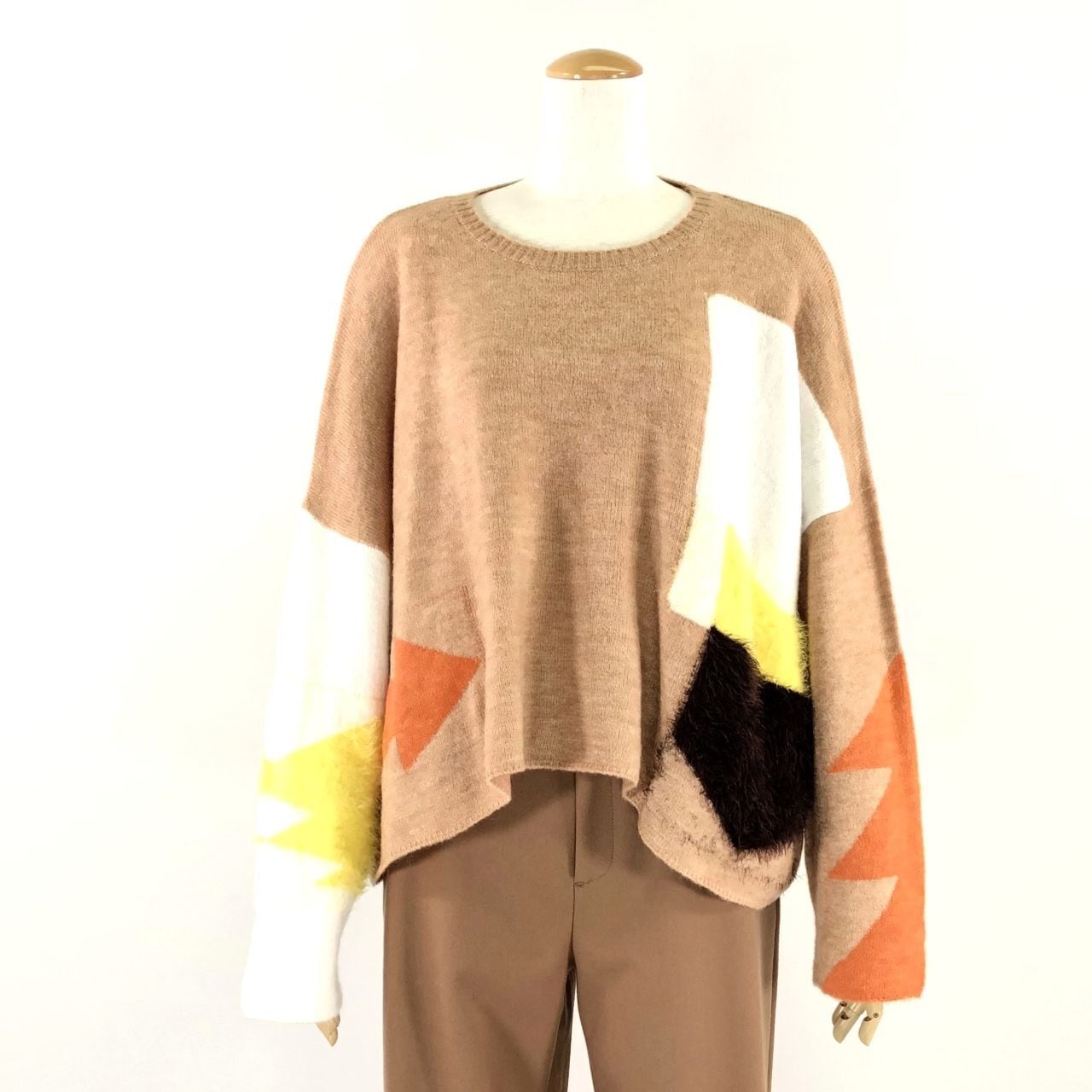 明るいブラウンをベースに、ホワイトやオレンジの異素材のパッチが絶妙なバランスで配置された、存在感のあるカーディガン。ふわりとした質感の切り替えが、視覚と触感にリズムを生み出し、まるで抽象画のような佇まいに。シンプルなボトムに合わせるだけで、スタイリングに深みと遊び心を添えてくれます。日常にアートを取り入れるような、感度の高い一枚です。